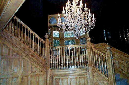 Front hall. The panelling, stairs and ballustrade are of Golden Oak, but have been antiqued in a lighter color to brighten the space.