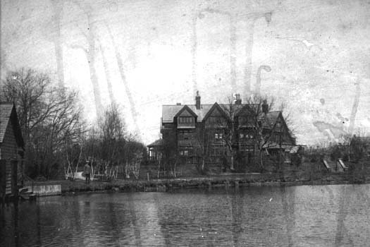 | Earliest known photograph. Taken shortly after completion of house in 1904. Man on the bank is Elwood Milderberger, who was the original owner. Note the position of the boathouse on the left of this photo, and the round porch on left of house. The coach house can be seen at far right. It was converted to a house by Rex Beech in the early 1950's and sold as a separate property. | |